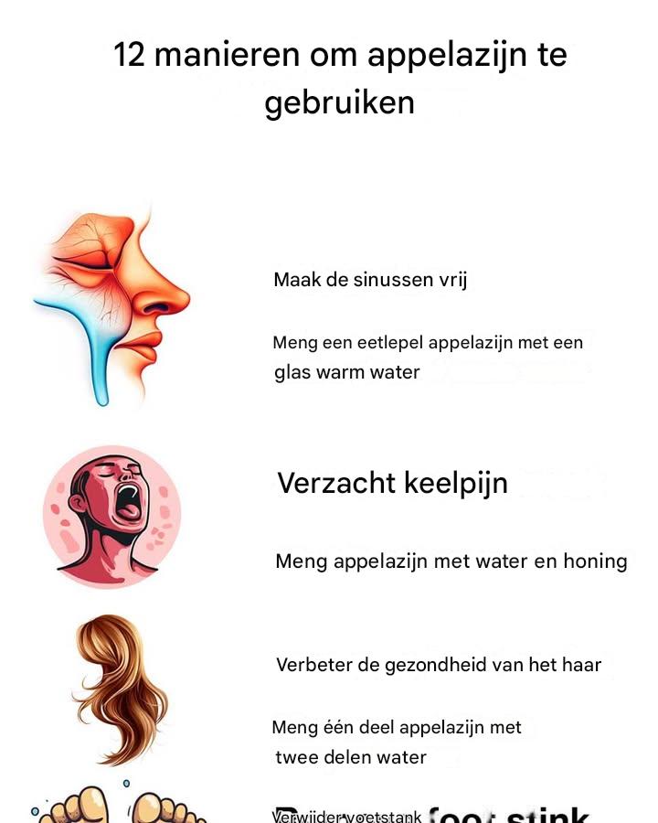 Appelazijn staat bekend om zijn vermogen om de gezondheid van het haar te verbeteren door de pH-waarde van de hoofdhuid in balans te brengen en productresten te verwijderen. Om appelazijn als haarspoeling te gebruiken, meng je één deel azijn met twee delen water en giet je dit na het wassen over je haar. Laat het een paar minuten intrekken voordat je het grondig uitspoelt. Dit kan resulteren in glanzender, gladder haar en een gezondere hoofdhuid.