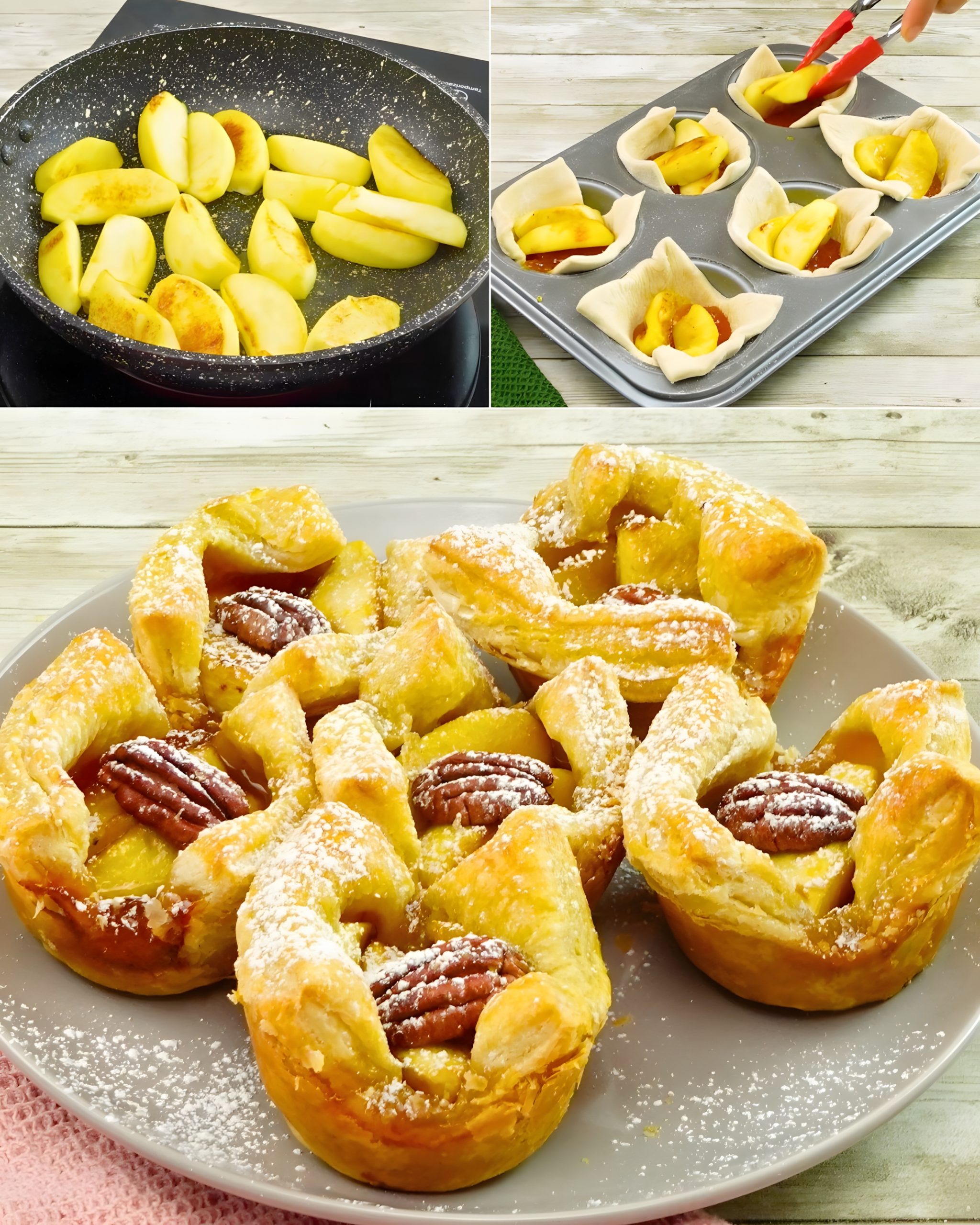 Deze schattige appelgebakjes in bladerdeeg zijn de perfecte combinatie van knapperig bladerdeeg en zoete, zachte appelvulling. Makkelijk te maken en prachtig om te zien, ideaal voor een gezellige high tea, een feestelijke brunch of gewoon als verwennerij bij de koffie! ☕🍎 Een heerlijke herfsttraktatie! 🍂
