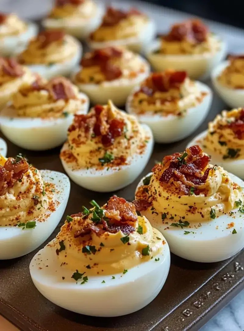 Duivelseieren zijn een klassiek aperitiefhapje dat op elke bijeenkomst of als snelle snack kan worden geserveerd. Deze deviled eggs op mijn manier gaan nog een stap verder door knapperig, verkruimeld spek toe te voegen voor een smaakvolle twist. De combinatie van romige eierdooiers, pittige mosterd en rokerig spek zorgt voor de perfecte bite, terwijl een snufje paprikapoeder voor de finishing touch zorgt.
