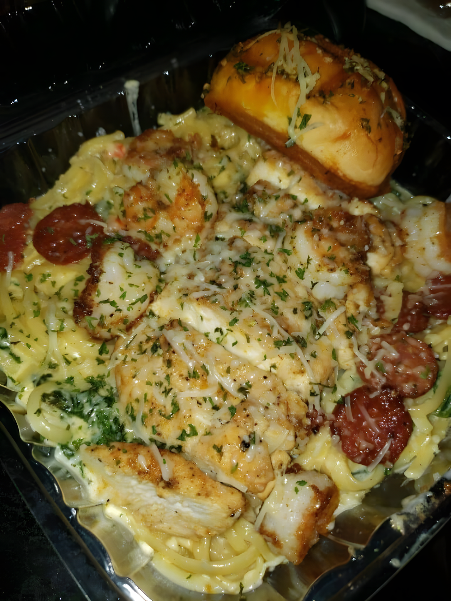 Deze Cajun Kip & Garnalen Alfredo is het ultieme comfort food! Sappige garnalen, malse kip en een rijke, romige Cajun-gekruide Alfredo saus komen samen in een onweerstaanbaar pastagerecht dat je smaakpapillen laat dansen! 😍🔥