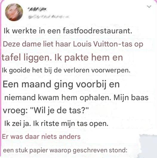 Toen ik een keer in een fastfoodrestaurant werkte, ontdekte ik een Louis Vuitton-handtas van een vrouw op tafel. Na twintig minuten wachten besloot ik hem naar de afdeling verloren voorwerpen te brengen, omdat ik wist dat ze niet meer terug zou komen. Ik legde hem gewoon neer en ging verder met mijn werk zonder erin te kijken.