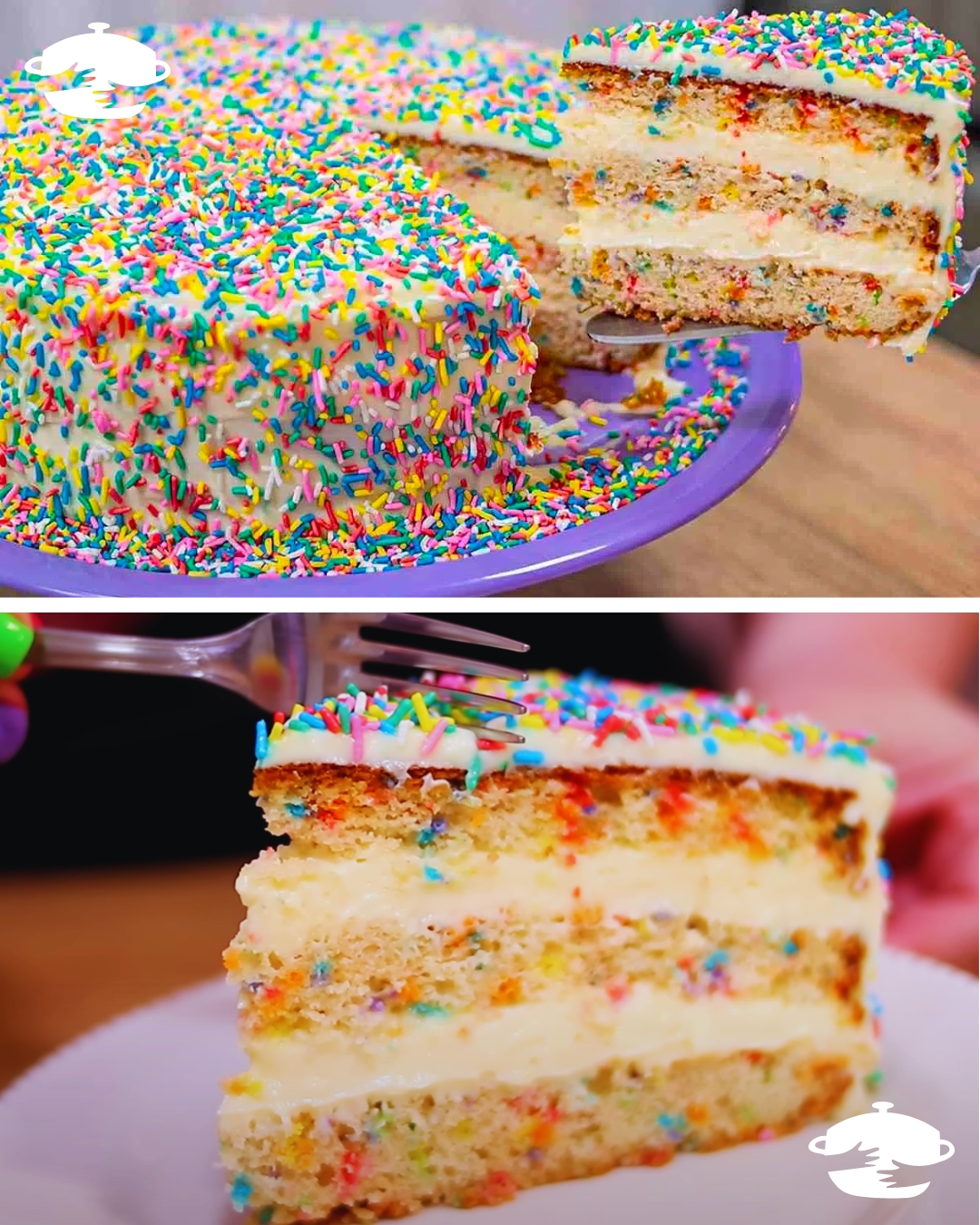 Om een taart voor een kinderfeestje te maken, gebruiken we tarwebloem, suiker, melk, olie, gekleurde parels, bakpoeder, zout en eieren. Klop de eieren, suiker en zout 2 minuten met een mixer, doe ze dan in een kom en voeg de overige ingrediënten voor de kindertaart toe, goed mengend. Giet het mengsel in een ingevette en met bloem bestoven ronde vorm en bak 45 minuten in een voorverwarmde oven op 180 graden. Haal de taart uit de oven, haal hem uit de vorm en verdeel hem in 3 gelijke helften. We moeten de juiste volgorde van voorbereidingen volgen, zowel voor de vulling en het glazuur als voor het samenstellen van de kindertaart. Strijk het glazuur glad, versier met gekleurde sprinkles en geniet van elk mooi stukje van deze magische taart voor een kinderfeestje!
