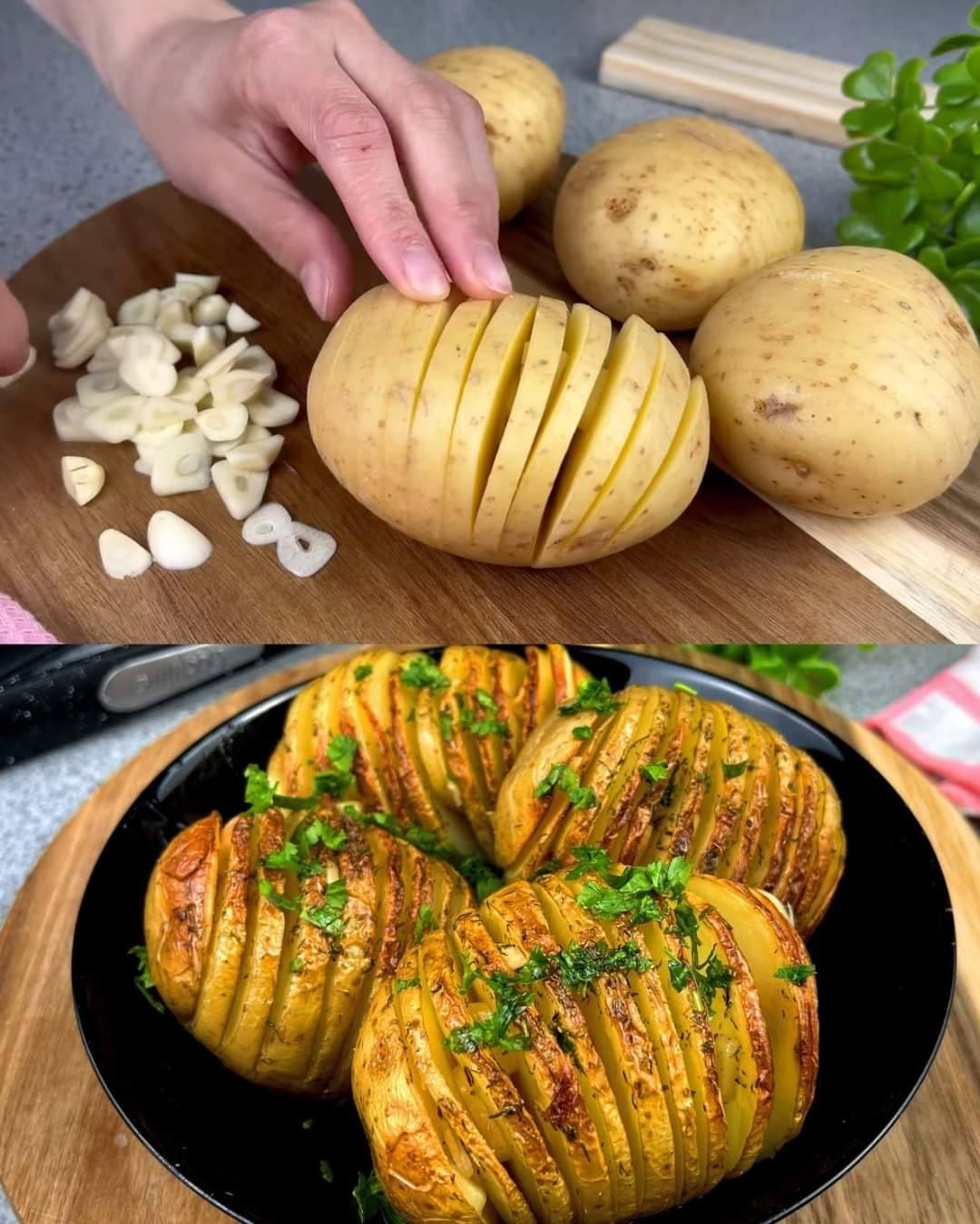 Proef de rijke smaken van gebakken aardappelen met knoflookboter, waarbij een knapperige schil en een zachte, boterachtige binnenkant samenkomen, doordrenkt met aromatische knoflook en dille. Dit gerecht is een eenvoudige maar verfijnde traktatie, perfect om elke maaltijd een gastronomisch tintje te geven.
