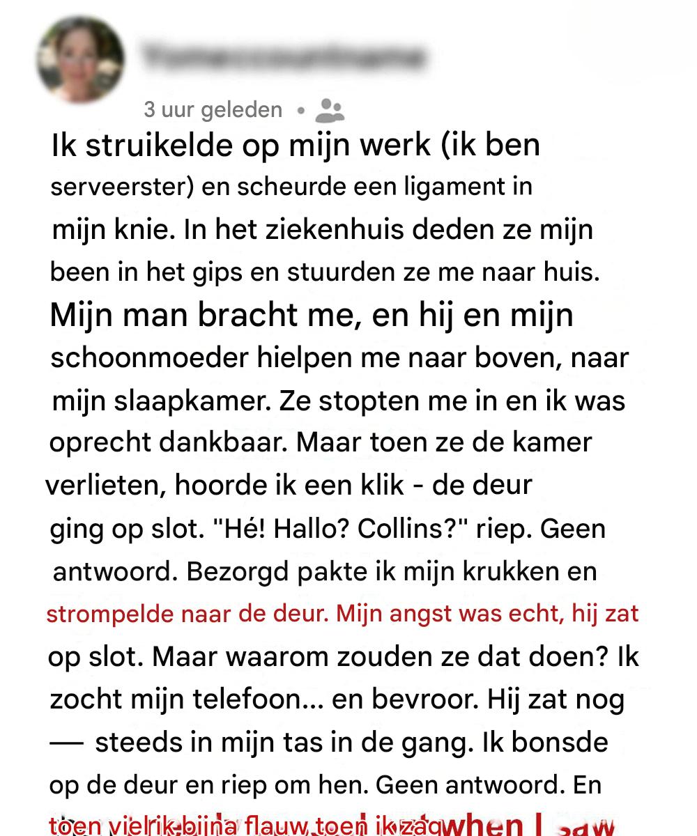 Collins beloofde dat hij voor me zou zorgen. Op de eerste dag droegen hij en Jenna me naar boven, klopten de kussens op, gaven me een glas water… en deden toen de slaapkamerdeur van buitenaf op slot.