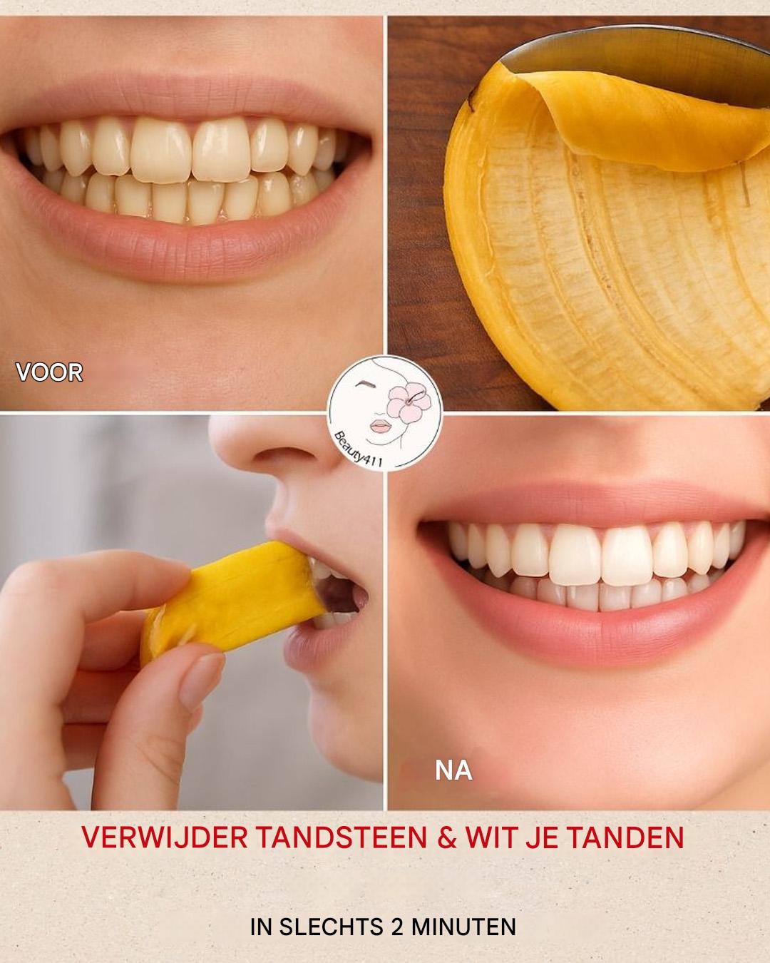 Je hoeft geen schurende oplossingen te gebruiken voor een wittere glimlach.  De kalium en magnesium in bananenschillen  kunnen je tanden zachtjes polijsten. Wrijf ze twee minuten per dag tegen elkaar: een  zachte beweging  voor zichtbaar wittere tanden.