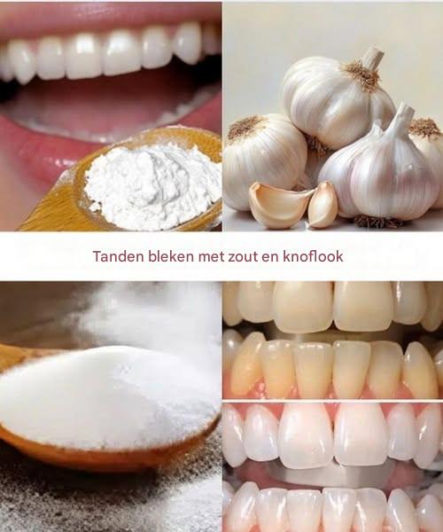 knoflook bevat allicine, een natuurlijke stof met antimicrobiële eigenschappen die bacteriën helpt elimineren die tandplak en vlekken veroorzaken. Zout daarentegen werkt als een mild schuurmiddel en reinigt de tanden zonder het glazuur te beschadigen.