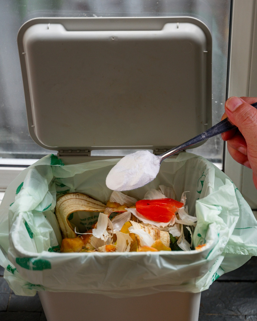 Strooi een laagje zuiveringszout op de bodem van de vuilniszak voordat u het afval erin gooit.