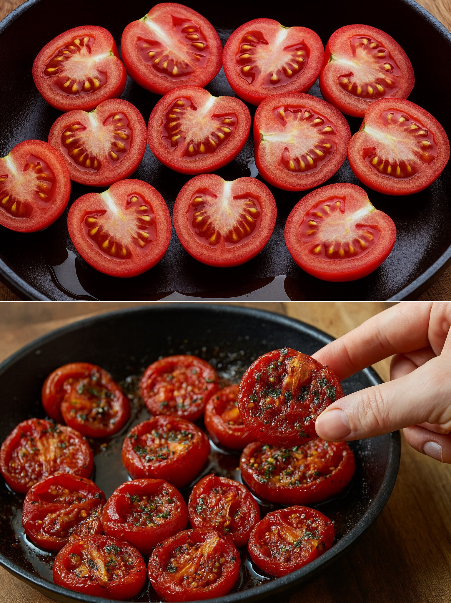 Wanneer de tomaten perfect rijp zijn – zoet, sappig en misschien wel vers geplukt – is het het perfecte moment om ze op deze manier te bereiden: gehalveerd, bruin gebakken in een pan en op smaak gebracht met verse rozemarijn en knoflook, die samen een onweerstaanbare geur afgeven. De resulterende saus is stevig en aromatisch, perfect voor bij een sneetje toast of een licht hoofdgerecht.