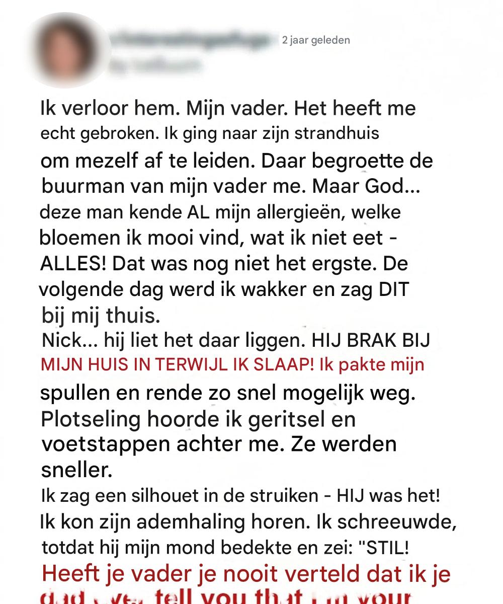 Na het overlijden van mijn vader huurde ik een strandhuis in een rustig kustplaatsje waar hij zich altijd terugtrok uit de chaos van de stad. Ik wilde dat het een helende reis zou worden – een manier om me dichter bij de man te voelen die me had opgevoed. Het huis was precies zoals hij het had beschreven: warm, sereen en omringd door bloeiende bloemen.