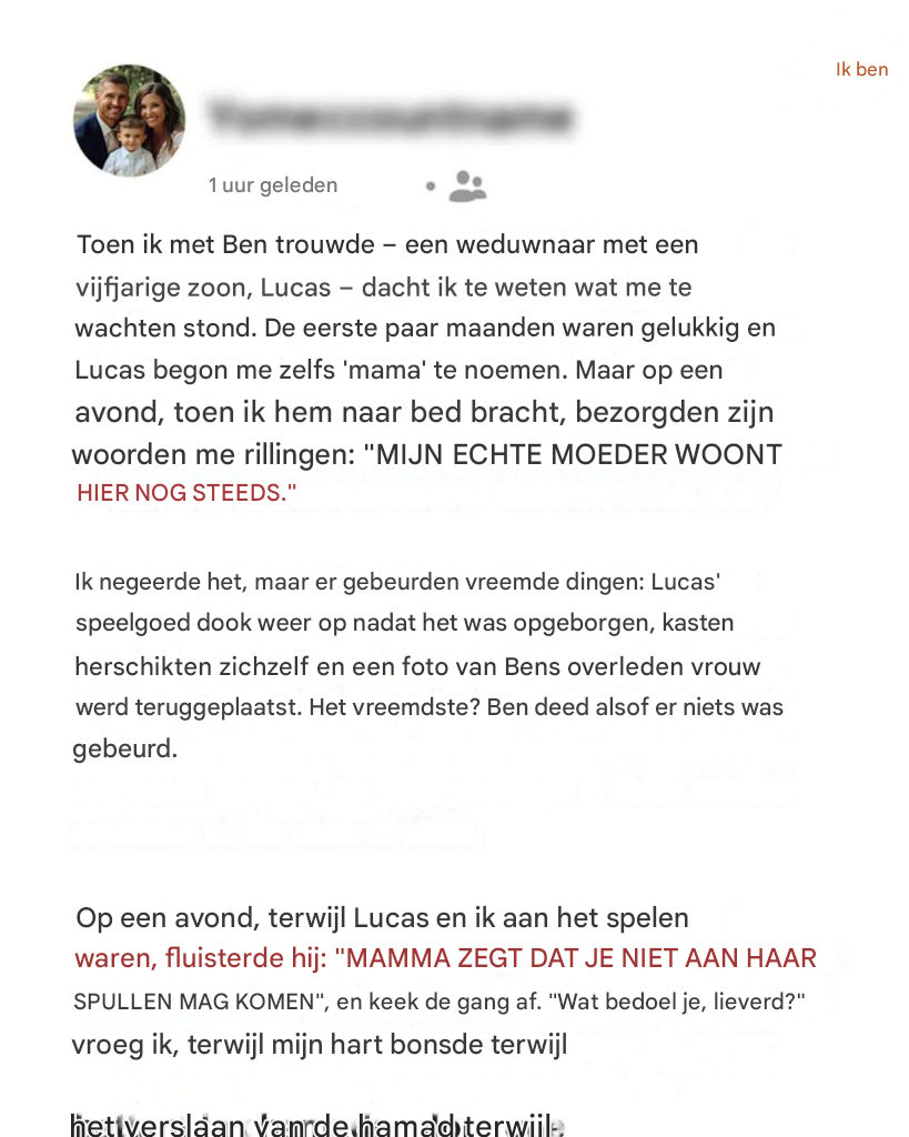 Ik trouwde met een weduwnaar met een jonge zoon. Op een dag vertelde de jongen me dat zijn echte moeder nog steeds in ons huis woonde.