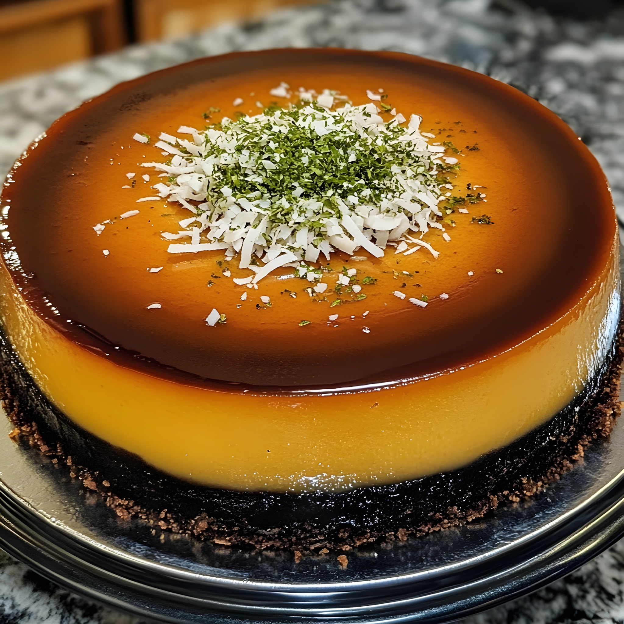 🌟 Een fluweelzachte flan met romige kokos, een goudbruine karamellaag en een heerlijke chocoladebiscuitbodem. Een dessert om van te dromen!