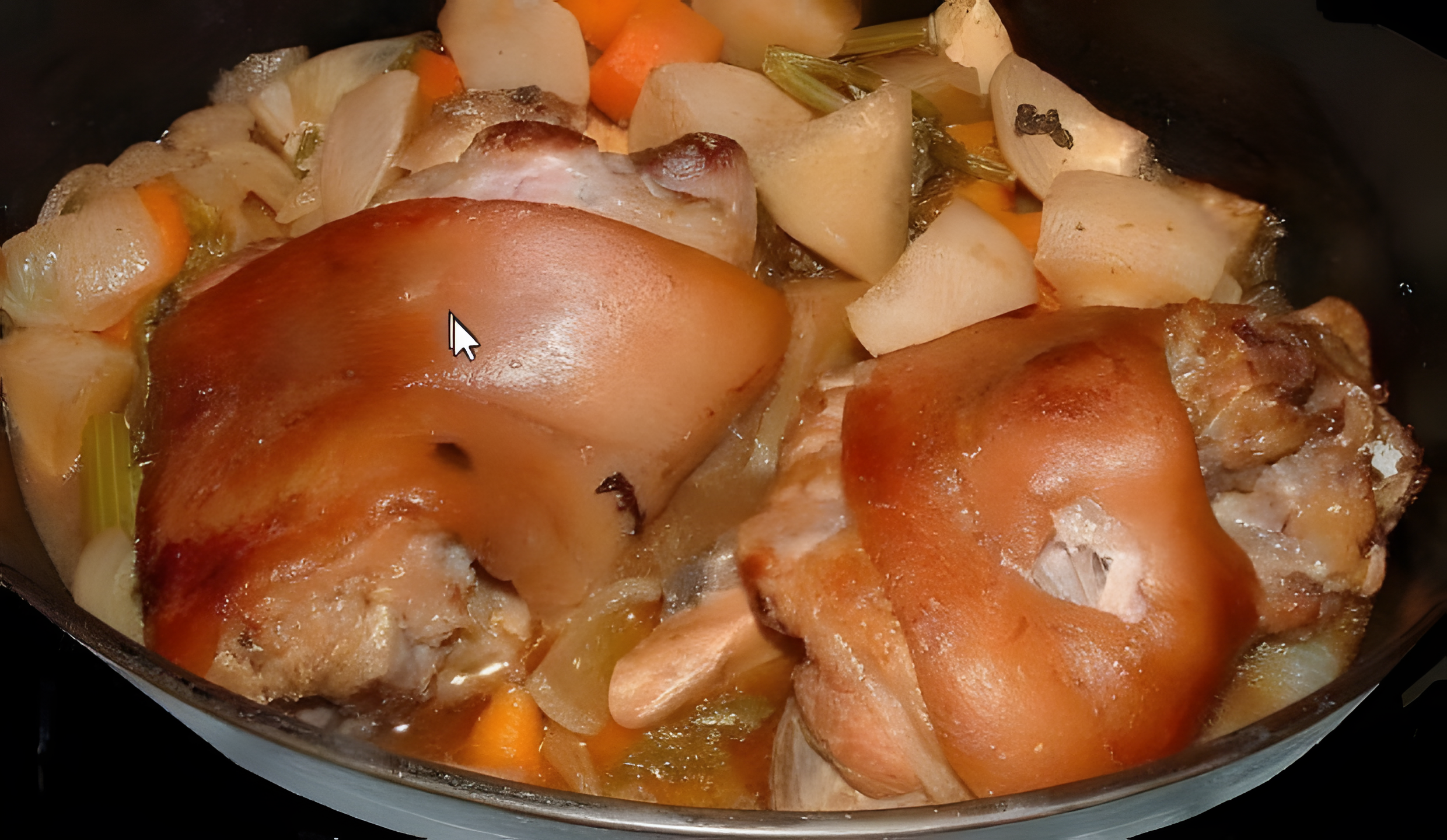 Een heerlijk mals gerecht waarbij de varkensschenkel langzaam wordt gegaard in een rijke bouillon met groenten. Perfect voor een stevige maaltijd!