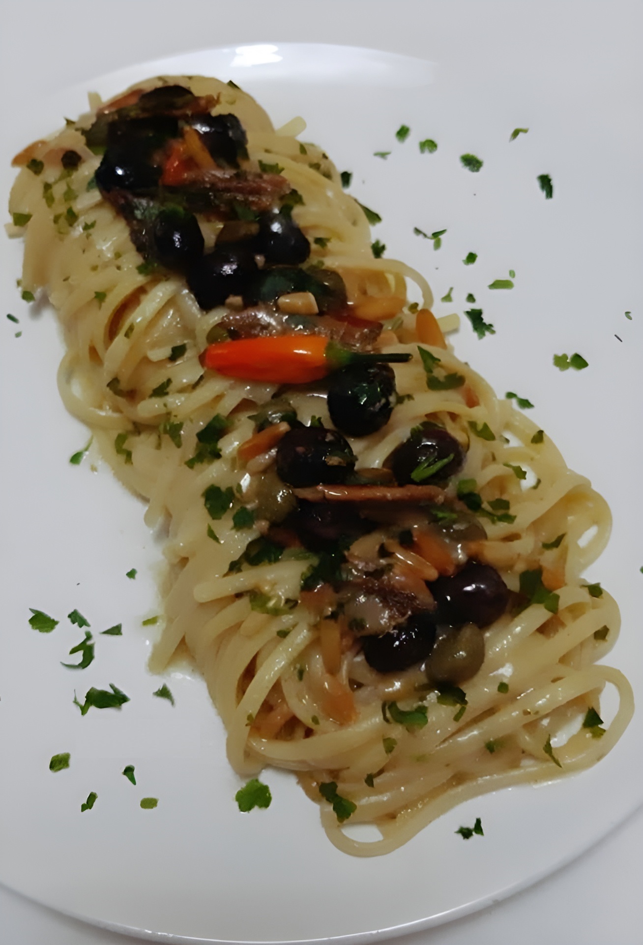 Linguine met ansjovis, olijven, kappertjes en pijnboompitten
