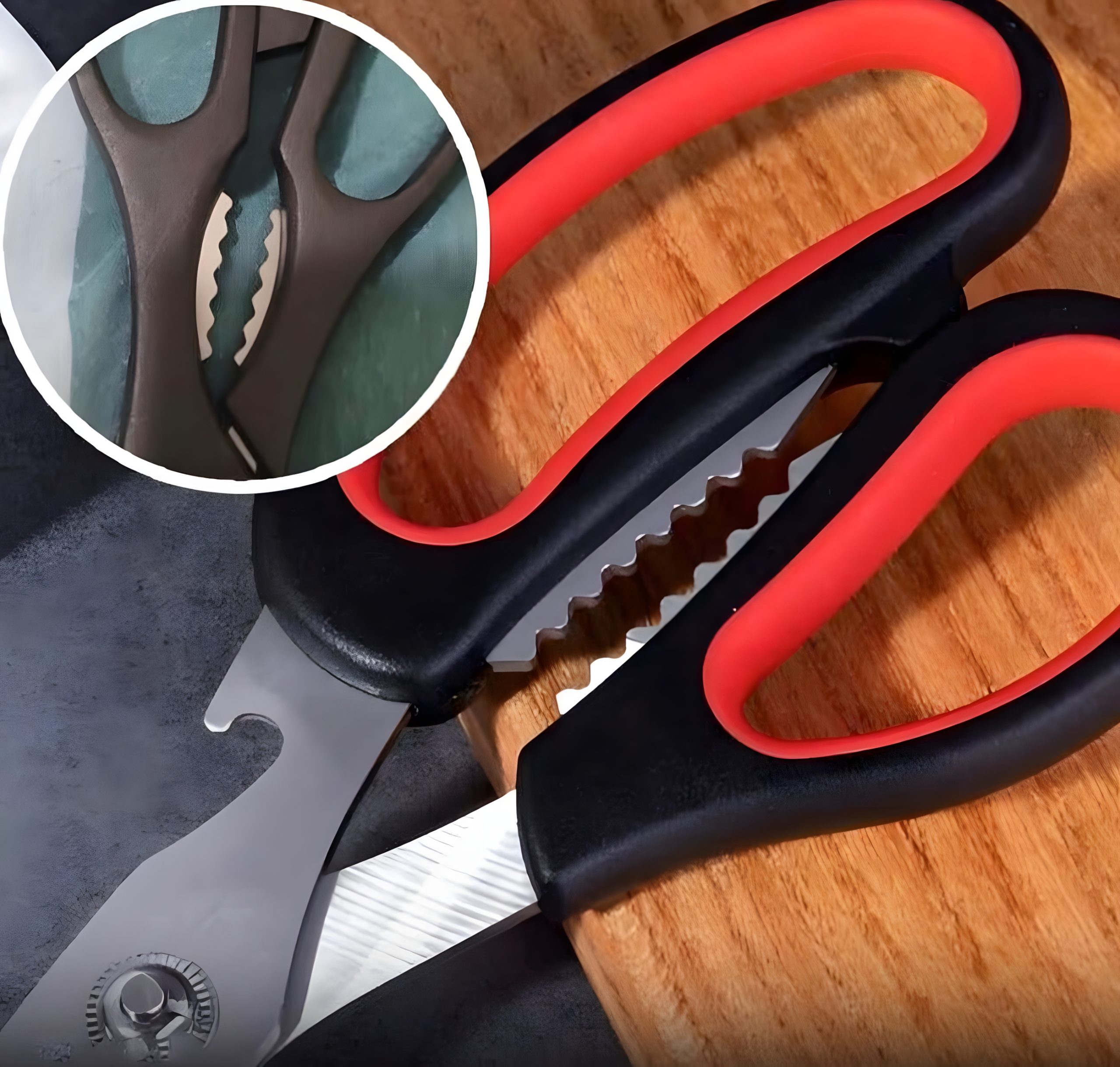 Het metalen stukje tussen de schaarhandvatten is namelijk een flesopener. Ja, echt! Dit slimme detail is ontworpen om flessendoppen moeiteloos te verwijderen. Geen gedoe meer met het zoeken naar een opener—je schaar kan het werk voor je doen. Handig tijdens het koken, een feestje of gewoon wanneer je een fles frisdrank wilt openen.