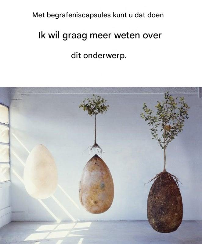 Dit is wat onze herhaalde pogingen tot verklaring aantonen. De meeste mensen hopen dat we als geesten zullen voortleven of zelfs herboren zullen worden. Maar hoe zou je je voelen als je wist dat je lichaam na de dood een boom kan voeden? Het is mogelijk dankzij deze bewonderenswaardige funeraire capsule.