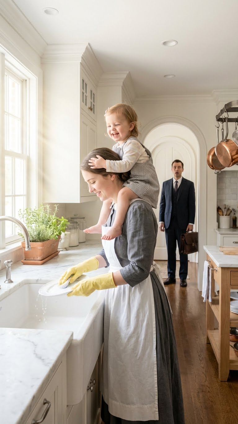 Ava siedziała na solidnym drewnianym krześle, jej drobne dłonie zanurzone były w mydlanej wodzie, obok młodej kobiety, którą Michael ledwo zauważał podczas swoich pośpiesznych poranków. Paige Collins, nowa pomoc domowa, zaśmiała się cicho, prowadząc palce Avy po talerzu.