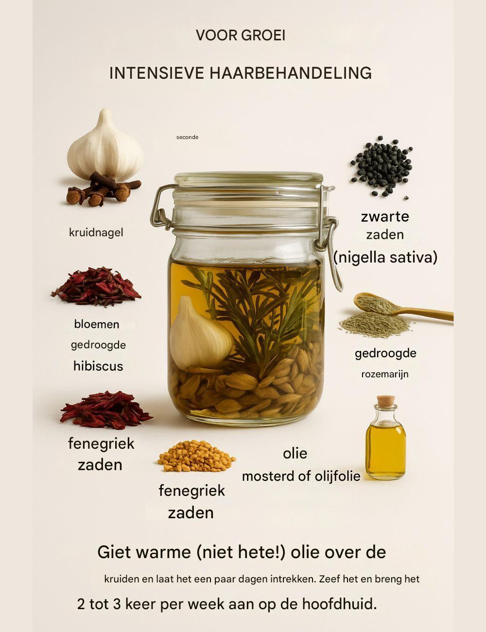 Natuurlijk drankje voor haargroei met een verschil! Een zelfgemaakte kruidenolie waar je hoofdhuid dol op zal zijn – chemievrij, maar met de kracht van de natuur. Ingrediënten: Knoflookteentjes, gedroogde hibiscusbloemen, fenegriekzaad, zwarte komijnzaadjes 💆♀️💪