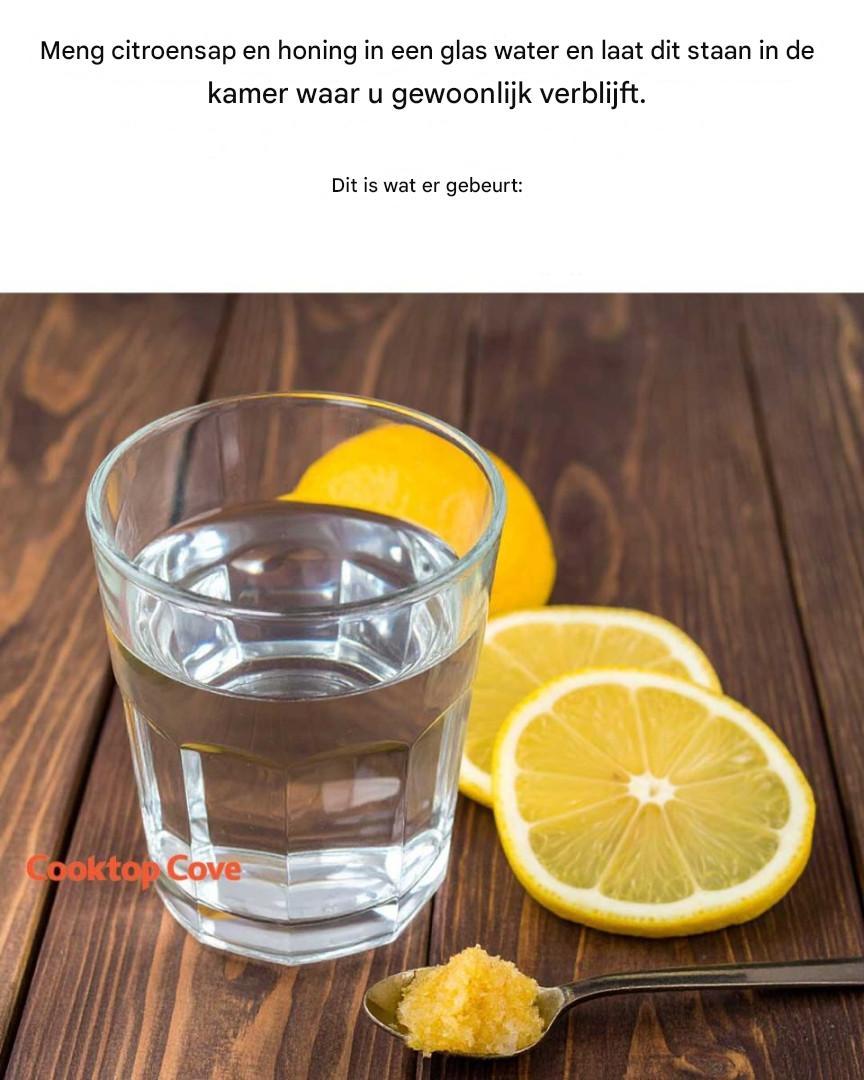 De combinatie van citroensap en honing in water werkt als een natuurlijke luchtverfrisser en verspreidt een aangename citrusgeur die onaangename geurtjes kan maskeren. De etherische oliën in de citroenschil komen vrij en zorgen voor een fris en verkwikkend aroma. Om deze natuurlijke luchtverfrisser te maken, meng je het sap van één citroen met een eetlepel honing in een glas water en zet je dit op een centrale plek in de kamer.