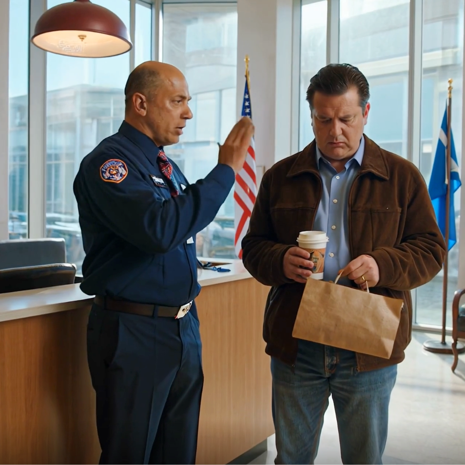 Odwiedziłem moją żonę, prezeskę, i napiłem się kawy — strażnik się roześmiał, wskazał na wychodzącego „jej męża” i wymienił nazwisko jej wiceprezes — więc uśmiechnąłem się, milczałem i postanowiłem się przyłączyć.