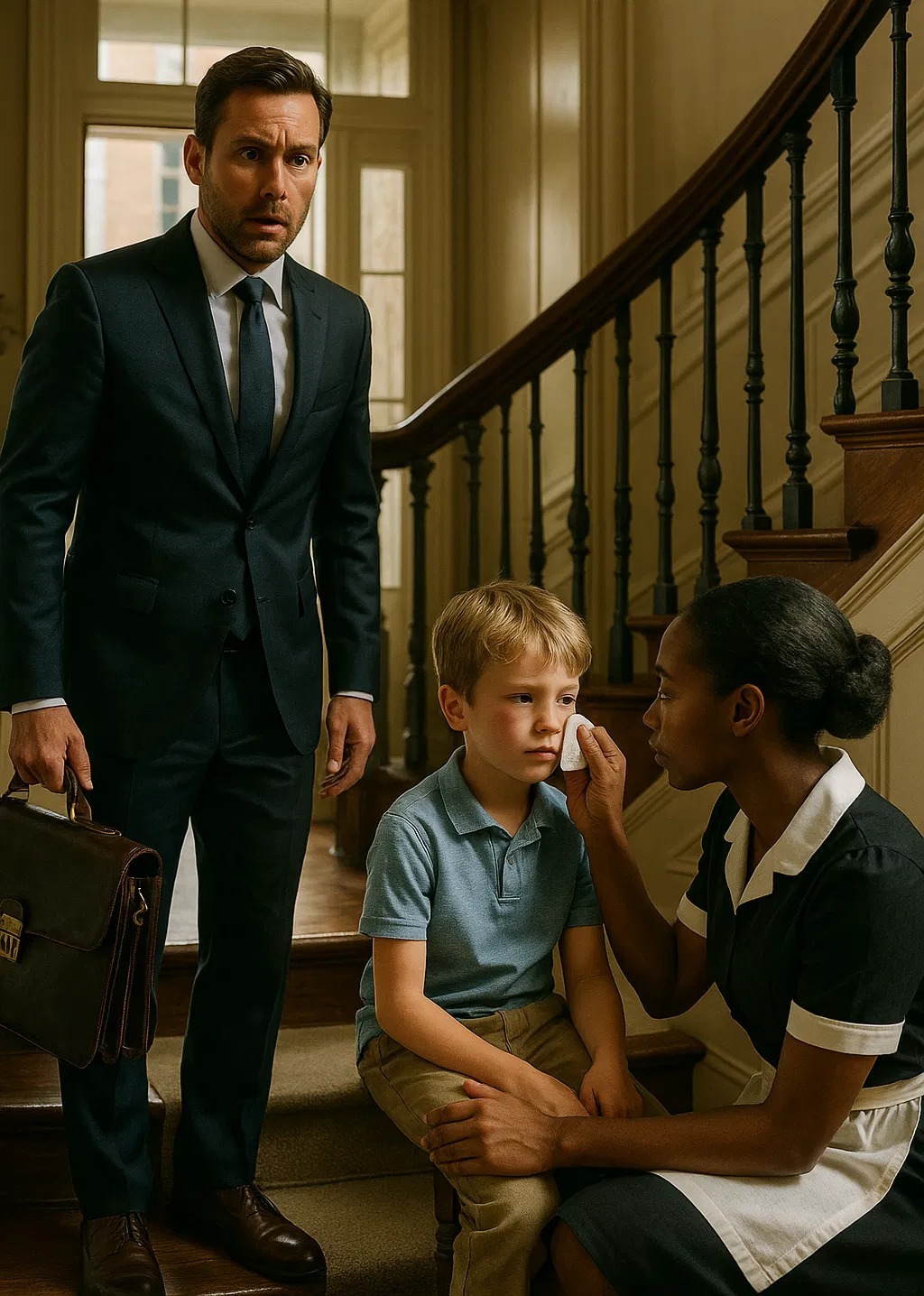 Przeszedł przez frontowe drzwi, wciąż trzymając teczkę. Na schodach siedział sztywno jego ośmioletni syn, Oliver, z niebieskimi oczami błyszczącymi od niespełnionych łez. Na jego policzku widniał lekki siniak. Klęcząca przed nim opiekunka rodziny, Grace, delikatnie osuszała go chłodną szmatką, sprawiając, że cały hol przypominał kaplicę.