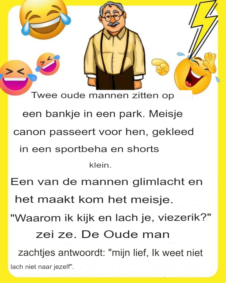 Twee oudere mannen zitten op een bankje in het park. Een knappe jonge vrouw rent voorbij in een sportbeha en een kort broekje. Een van de mannen glimlacht, en dat trekt de aandacht van de vrouw. « Waarom kijk je naar me en glimlach je, viezerik? » vraagt ze. De oude man antwoordt vriendelijk: