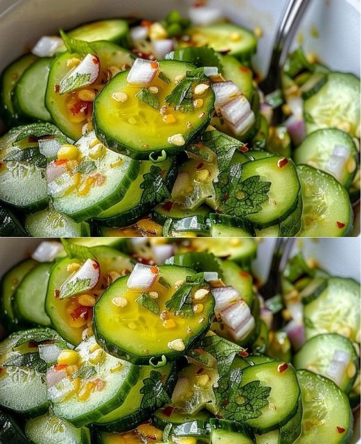 ⭐ Gepekelde Komkommersalade ⭐ ✨ Beoordeling: 4.8/5 🍽 Porties: 4 ⏰ Voorbereidingstijd: 10 minuten ⏰ Totale Tijd: 40 minuten (inclusief pekelen) 📊 Calorieën: 90 kcal per portie 🥒 Ingrediënten: 2 grote komkommers, dun gesneden 🥒 1 kleine rode ui, fijngehakt 🧅 2 teentjes knoflook, fijngehakt 🧄 100 ml appelciderazijn 🍎 2 eetlepels suiker 🥄 1 … Lire plus