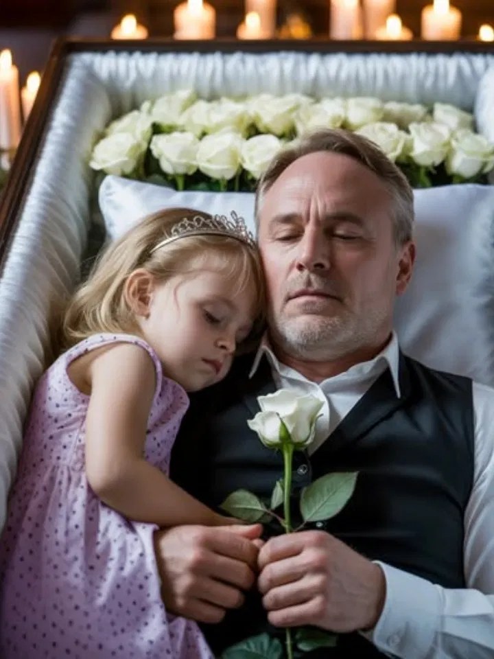 Kiedy ceremonia dobiegła końca, ludzie zaczęli wychodzić małymi grupkami, szepcząc, jacy jesteśmy „silni”. Lily odmówiła odejścia. Dopiero dwóch członków rodziny delikatnie wyjęło ją z trumny i pozwoliło zakładowi pogrzebowemu zamknąć ją na noc. Nie krzyczała ani nie stawiała oporu, po prostu wpatrywała się w twarz taty, jakby zostawiała tam cząstkę siebie.