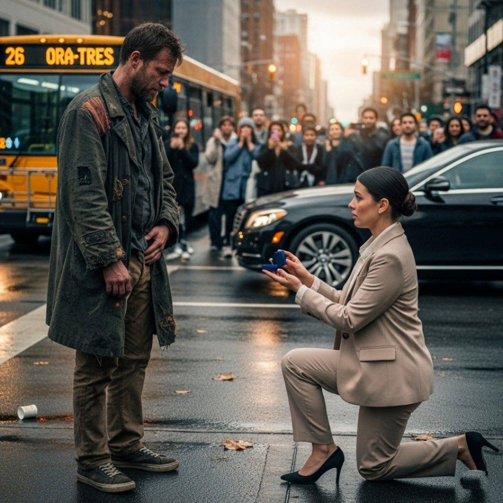 Niebo zasnuła delikatna zasłona deszczu, gdy ludzie przemykali z uniesionymi parasolami i spuszczonymi oczami – ale nikt nie zauważył kobiety w beżowym kostiumie, która upadła na kolana na środku skrzyżowania. Jej głos drżał. „Proszę… wyjdź za mnie” – wyszeptała, ściskając aksamitne pudełko.