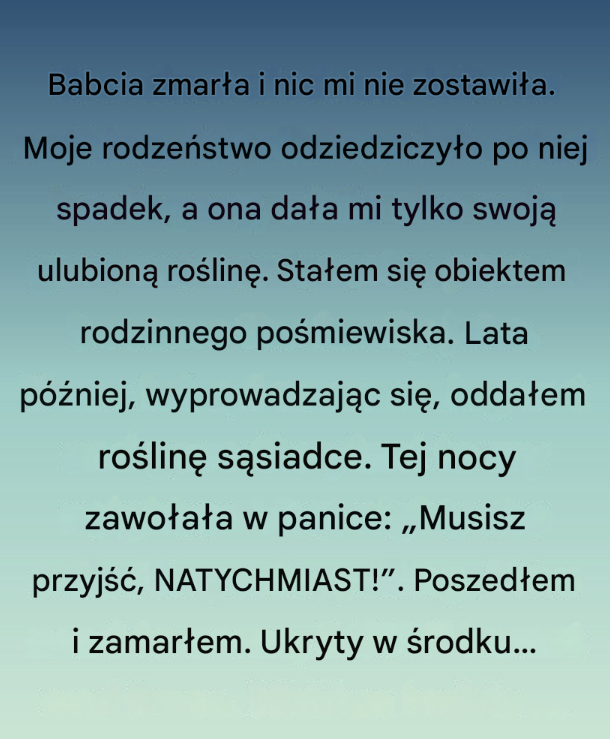 Testament babci pojawił się i zniknął, a podczas gdy moje rodzeństwo paradowało z kopiami aktów własności i wycenami biżuterii, ja wróciłem do domu z… rośliną. Jej ulubioną, owszem – chudą i upartą, z wyblakłymi od słońca liśćmi – ale jednak. Rośliną. Mój brat nazywał ją „doniczkową litością”. Siostra zapytała, czy potrzebuję pomocy, „żeby przynajmniej ją utrzymać przy życiu”.