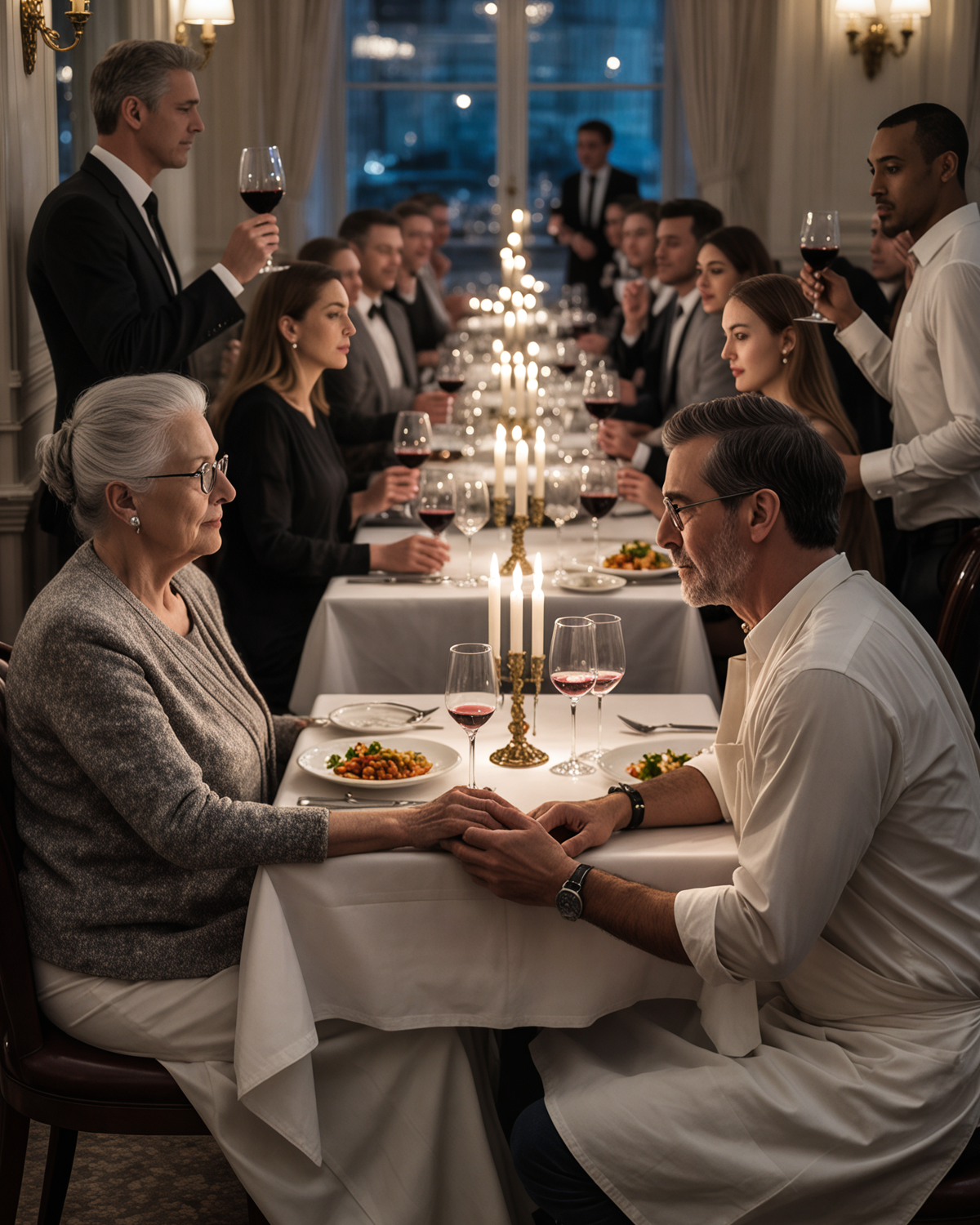 Eliza weszła do środka, ubrana w znoszony wełniany sweter, długą szarą spódnicę i proste buty ortopedyczne. Jej włosy były starannie upięte, a wzrok przenikliwy zza okularów w drucianych oprawkach. Stała cicho przy wejściu, niemal niezauważona – dopóki maître d’hôtel nie odwrócił się w jej stronę.
