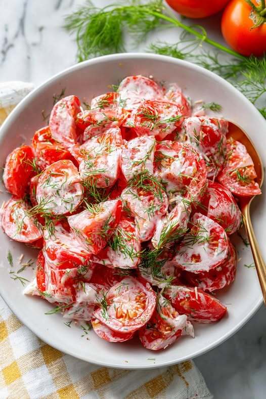 Zeg vaarwel tegen flauwe groenten en hallo tegen deze levendige salade zonder koken, boordevol smaak. Sappige tomaten, een romige knoflookdressing, verse dille en een vleugje zuur in een gerecht dat perfect combineert met gegrild vlees of de show zou kunnen stelen bij je volgende familiediner. Het is simpel, bevredigend en verslavend.